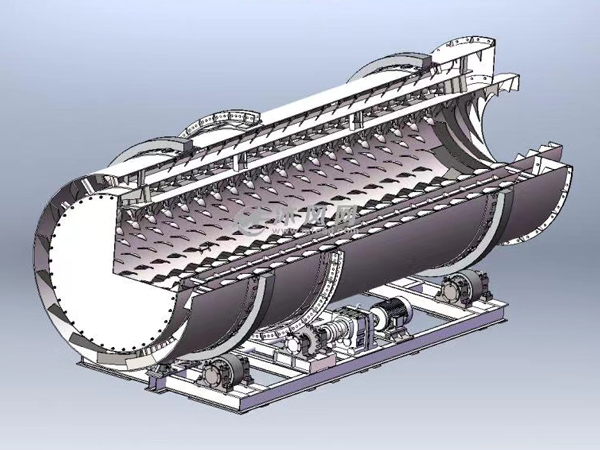 The main body of the single-drum dryer is a cylinder, with a rotating shaft and gear system inside, and a heater and cooling device outside.